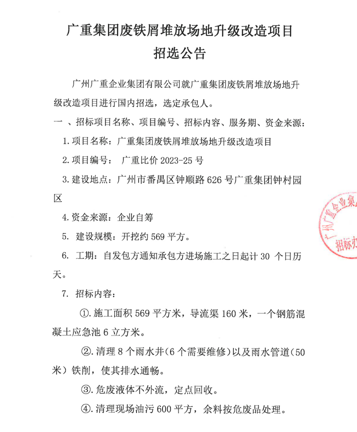 廣重集團(tuán)廢鐵屑堆放場地升級(jí)改造項(xiàng)目招選公告