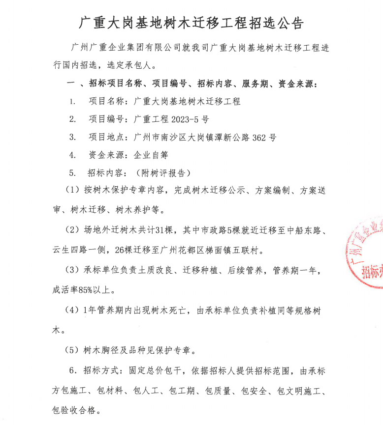 廣重大崗基地樹木遷移工程項(xiàng)目招選公告